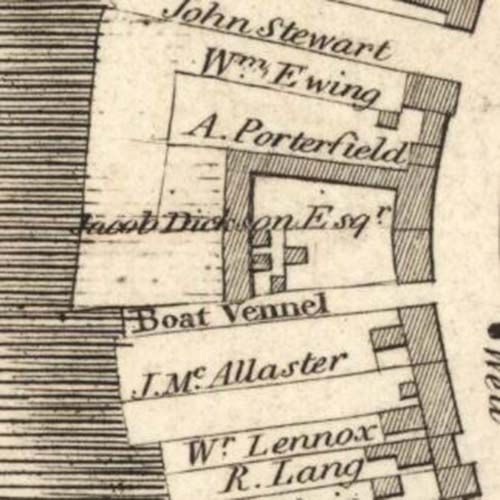 Wood's map of 1818 shows the complex on land owned by Jacob Dickson, one of the partners of the company and, for a while, the Provost of Dumbarton.