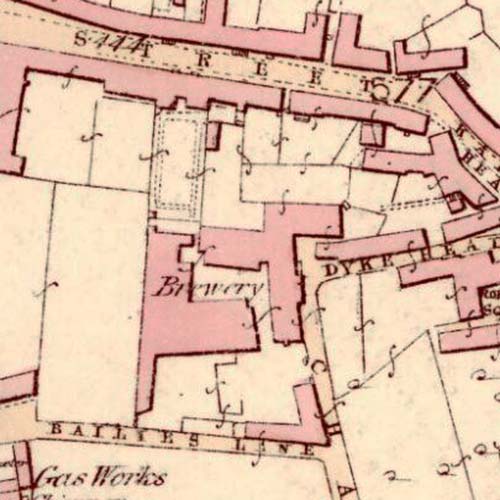 The Bathgate Brewery was established in the old tanworks in Chapel Lane. After its sale in the late 1860s it became the site of the West Lothian Flint Glassworks. Following a fire in 1924, the site was cleared for housing and new commercial buildings.
