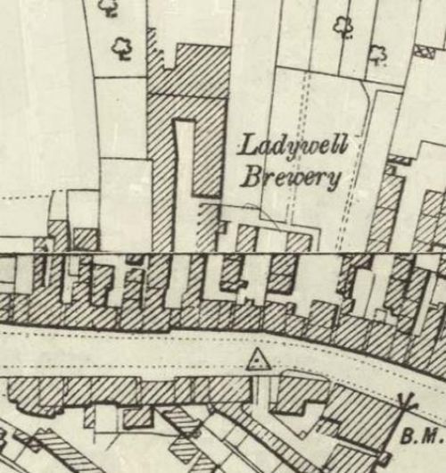 The Ladywell Brewery stretched north from the High Street, on a long piece of land, to New Street. Most of the site has been cleared for a modern housing development, but the company offices survive on the High Street, converted to private residences.
